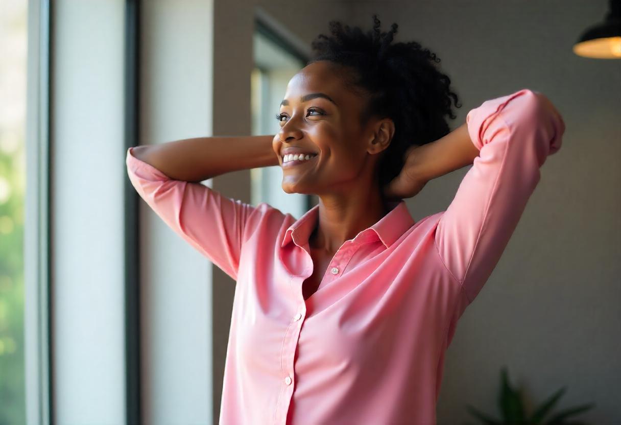 mulher com expressão calma e relaxada demonstra bem-estar no trabalho