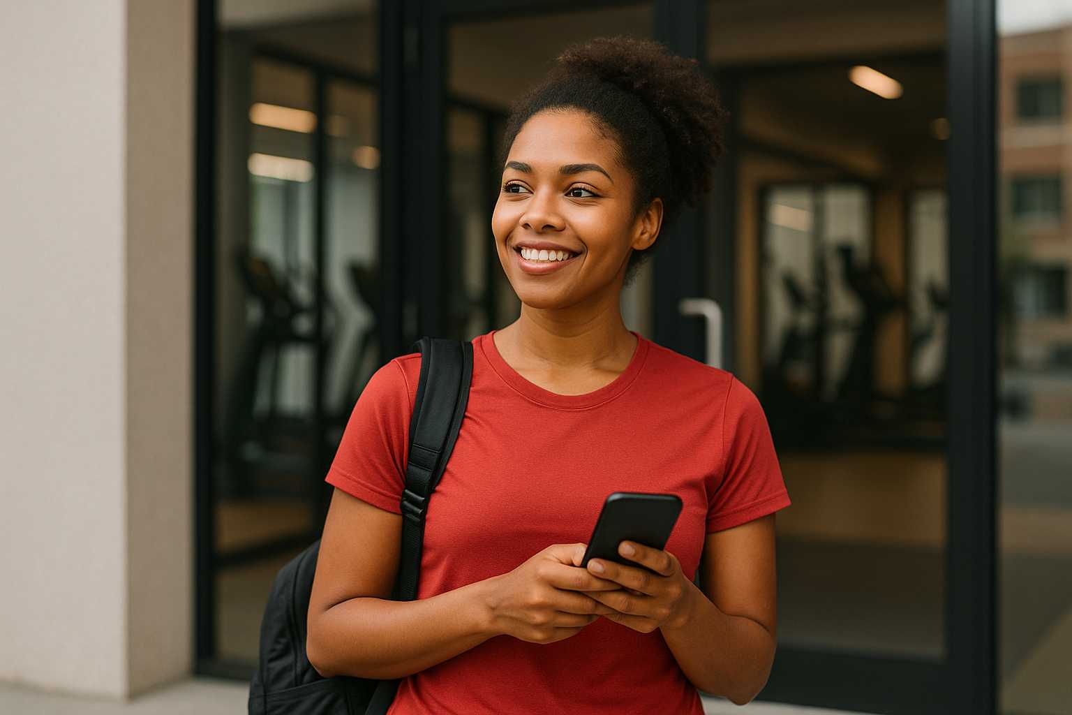 mulher segura celular em frente à academia e paga com Ticket bem-estar academia